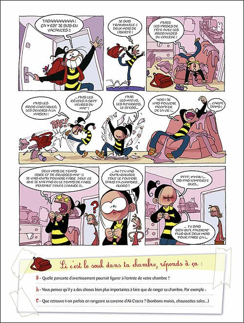 Côté famille, elle est coincée entre sa mère ancienne baba cool et aujourd’hui baba stressée, un père programmateur de génie incapable de programmer la machine à laver, une grande soeur canon du collège et irrécupérable cancre, et une petite soeur encore bébé et donc forcément trop favorisée.